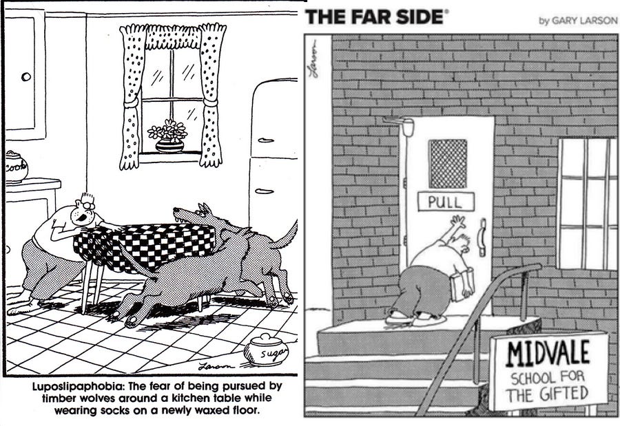 Personally, I was not a regular follower of Scott Adams. Unlike Alexander, I did not read all the Dilbert collections. In fact, when I first came across Dilbert, I didn’t think it was very funny. And while I can see that Scott Adams was a jovial and fun joker, I still don’t care much about Dilbert. The really funny strips are maybe only one of every ten, and the mildly amusing ones only six or seven of every ten. Unlike The Far Side, which was often based on translating slapstick humor into single-panel static illustrations (a male clown prepares to throw a pie in the face of a female clown, and she: “Not on the first date, you don’t!”) or based on whimsical use of language (”Luposlipophobia”), Dilbert was often a dunk on someone that depended on the same type of humor one would find in an office space. I don’t mean the topics were about office life, but the actual humor was of the kind one might hear from co-workers, with humorous in-group allusions and rather flat punch lines. A lot of times, the joke was actually in the second panel. “If the company nurse drops by, tell her I said ‘never mind’” is a pretty weak third panel when the first panel introduces the idea of “eunuch programmmers” and the second panel conflates “eunuchs” and “Unix”. Alexander says the humor is about nerds. I suppose he’s right, although I think The Far Side’s famous nerd trying to enter a school for the gifted is essentially a Dilbert strip with a proper punch line and shows what Dilbert should have been.